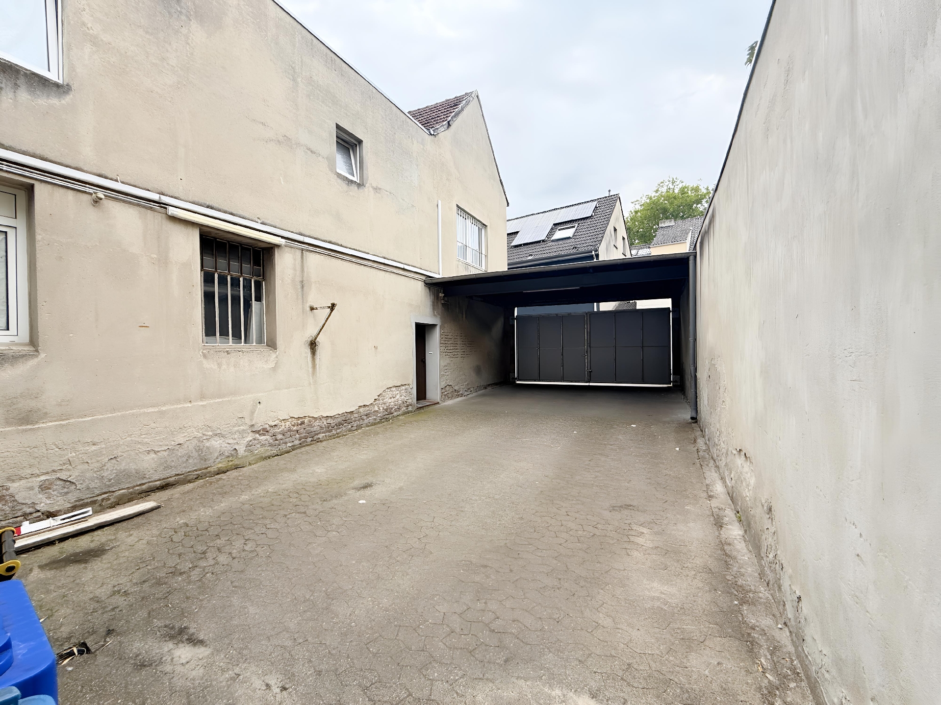 Die zweite Einheit kann ebenfalls eigenständig genutzt werden und verfügt ebenfalls über eine eigene Sanitäreinrichtung. Besonders hervorzuheben ist die angeschlossene Hoffläche, die exklusiv dieser Einheit zugeordnet ist. Hier stehen zwei Pkw-Stellplätze zur Verfügung, die auch als Anlieferzone oder für andere geschäftliche Zwecke genutzt werden können. Der Zugang erfolgt über den rückwärtigen Bereich der Immobilie.
