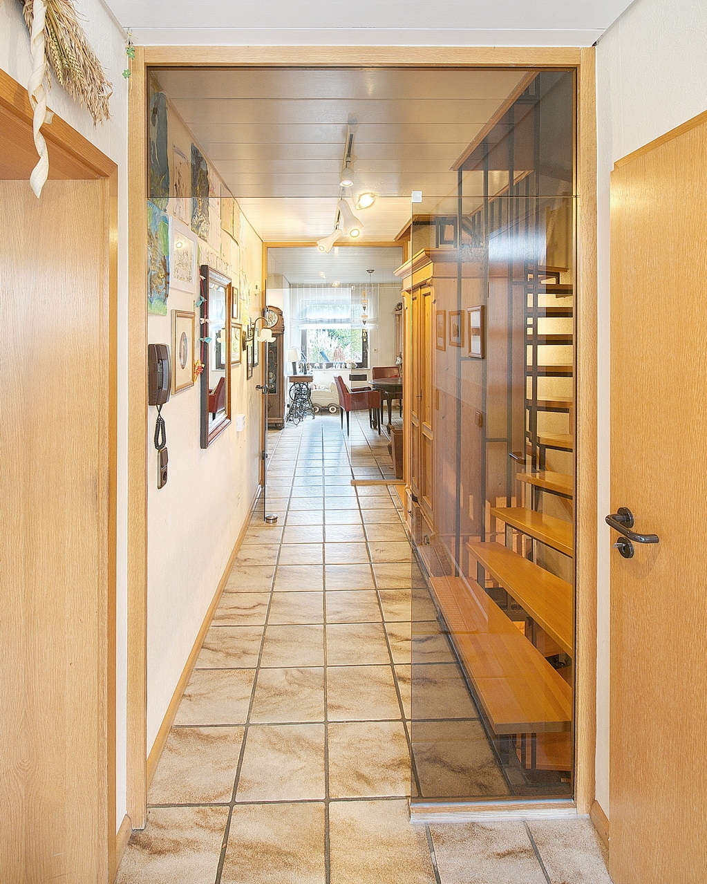 Im klassisch aufgeteilten Erdgeschoss befinden sich Küche, Gäste-WC sowie das geräumige Wohn-Esszimmer, das im Jahr 2006 um einen Wintergarten erweitert wurde. Dieser bietet Zugang zur angrenzenden Terrasse und zum südlich ausgerichteten Garten. An kalten Winterabenden sorgt ein Kamin im Wohnbereich für eine behagliche Atmosphäre.
