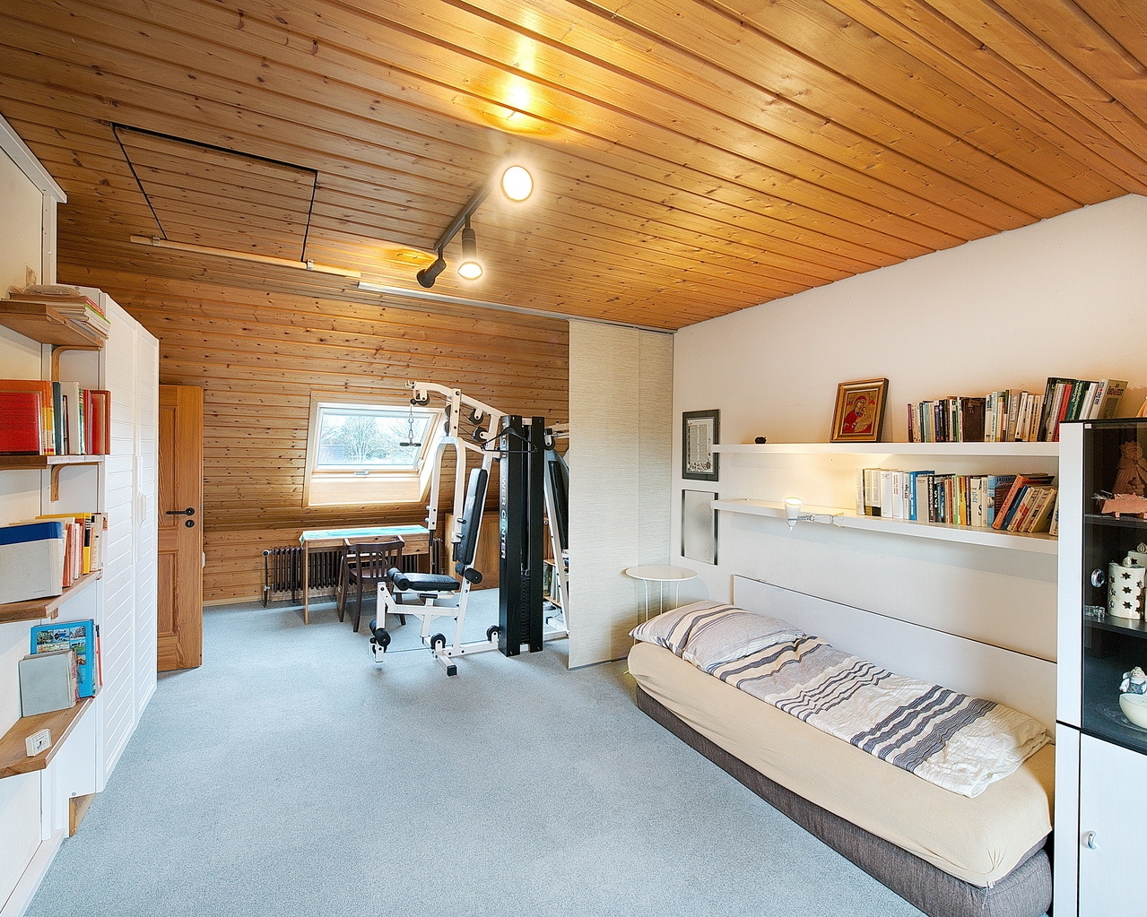 Die offen gestaltete Holztreppe führt ins Dachgeschoss, in dem sich jeder wohlfühlen wird. Hier stehen Ihnen ein weiteres Zimmer sowie ein Duschbad zur Verfügung.