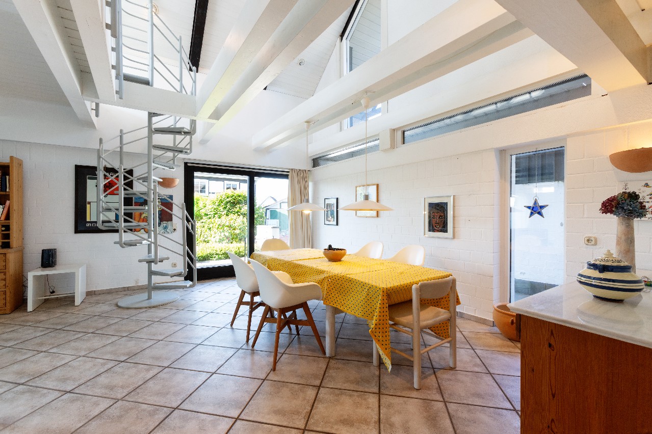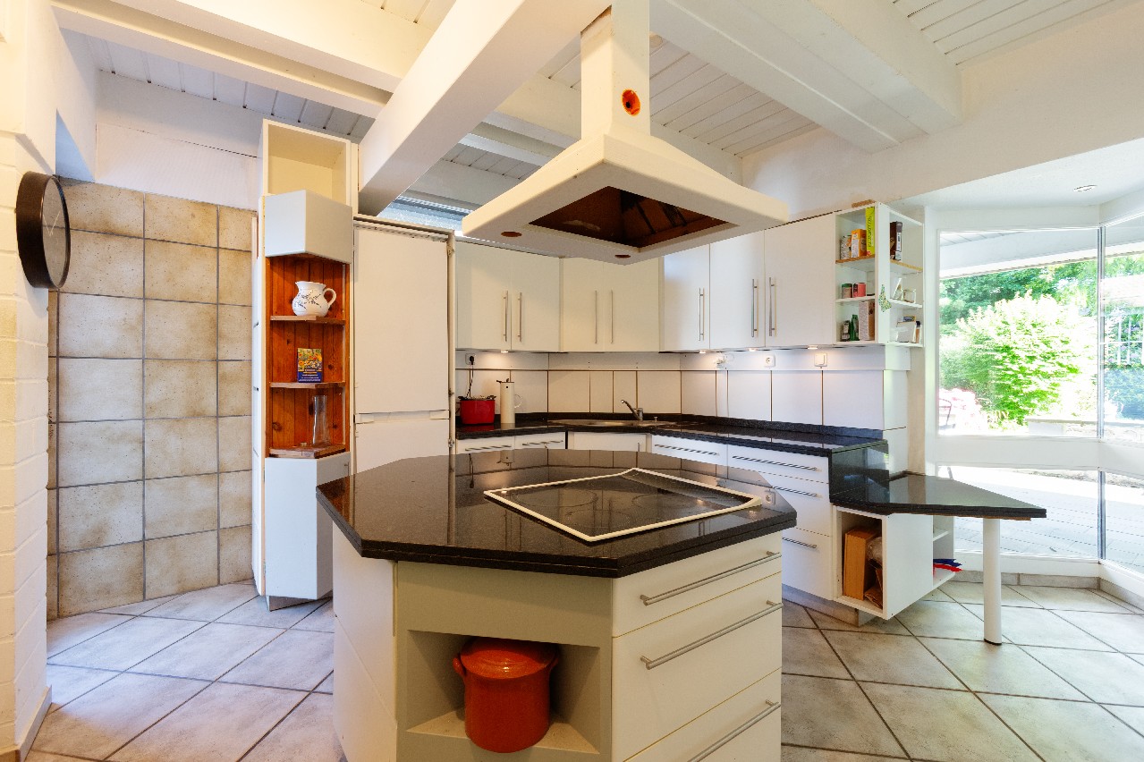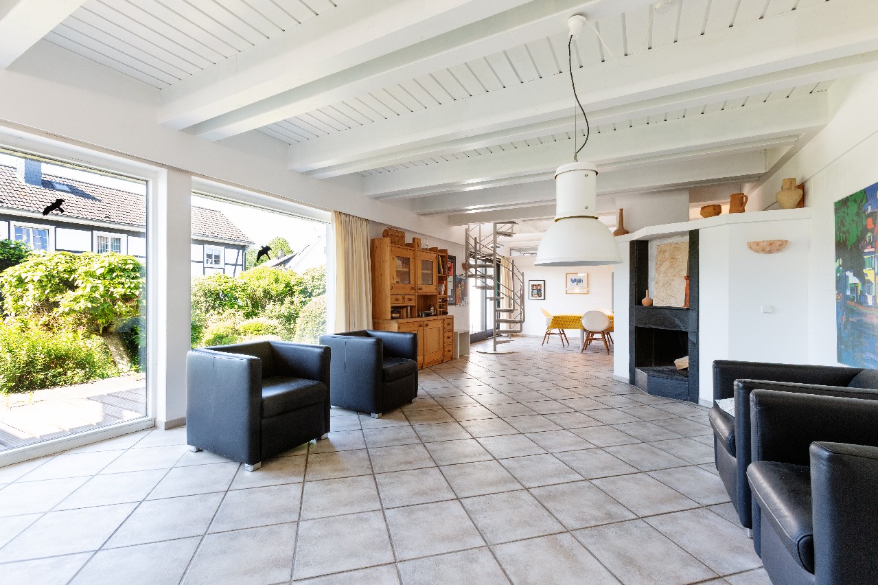 Ca. 56 m² großer Wohn- Essbereich mit offenem Kamin, großen bodentiefen Fensteranlagen, Schiebetür zu eigener frontseitiger Terrasse und sehr schönem sichtgeschützten Vorgarten, offener Wendeltreppe ins Dachstudio, hohen Decken sowie schönen sichtbaren Holzbalken. Zusätzlich Gäste-WC und eine Küche mit Kochinsel, verglastem Erker und direkter Eingangsmöglichkeit in Richtung Garage, um Einkäufe schnell ins Haus zu bringen.