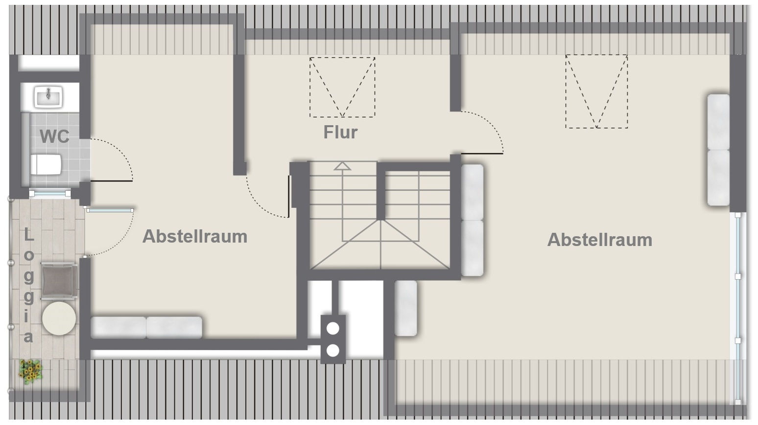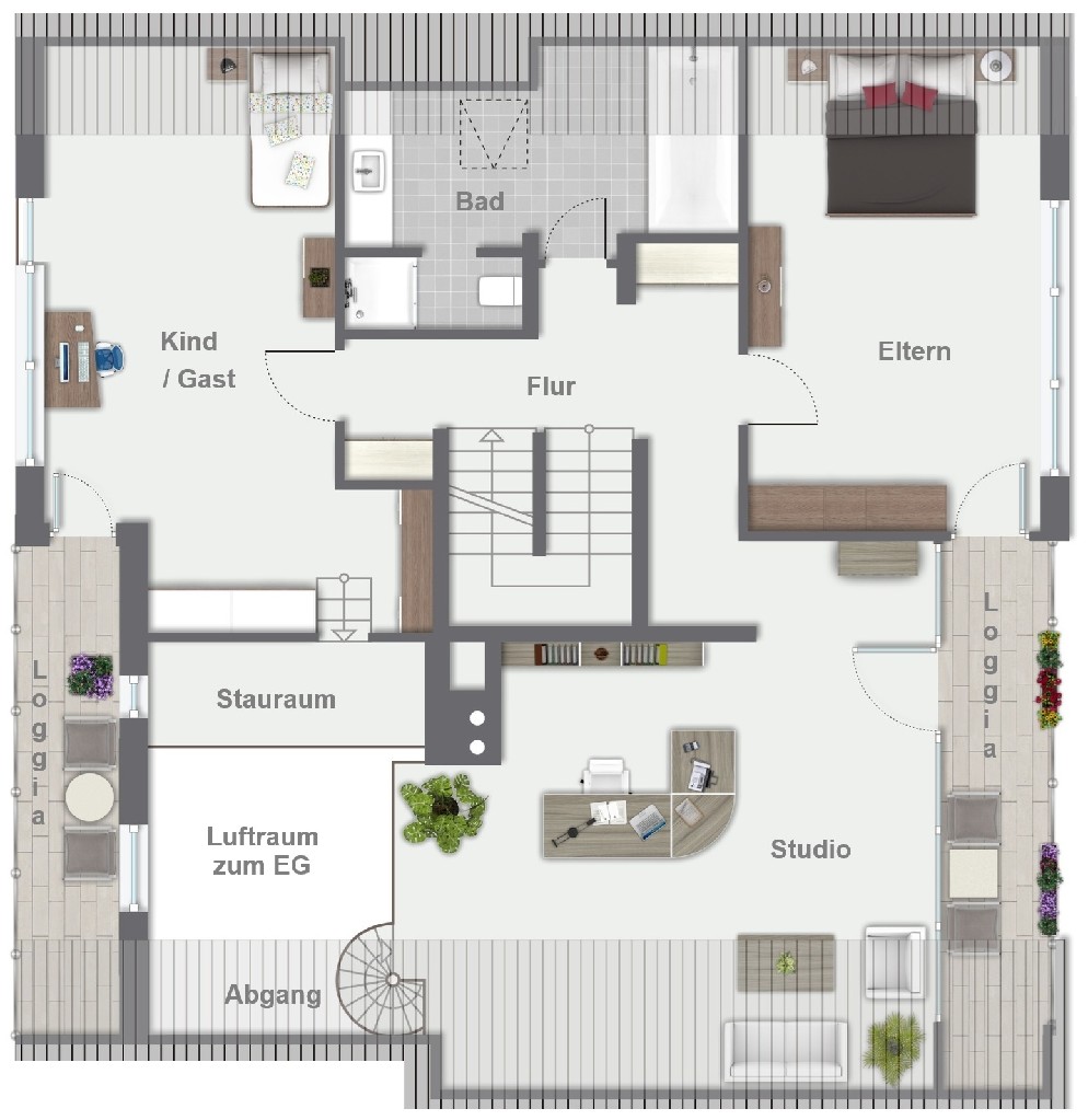 Zusätzlicher Zugang über offene Wendeltreppe aus EG ins Dachstudio mit ca. 28 m² Wohnfläche; zwei ca. 23 m² und ca. 17 m² große Schlafzimmer mit giebelseitigen Loggien; modernes und helles Badezimmer mit Tageslichtfenster