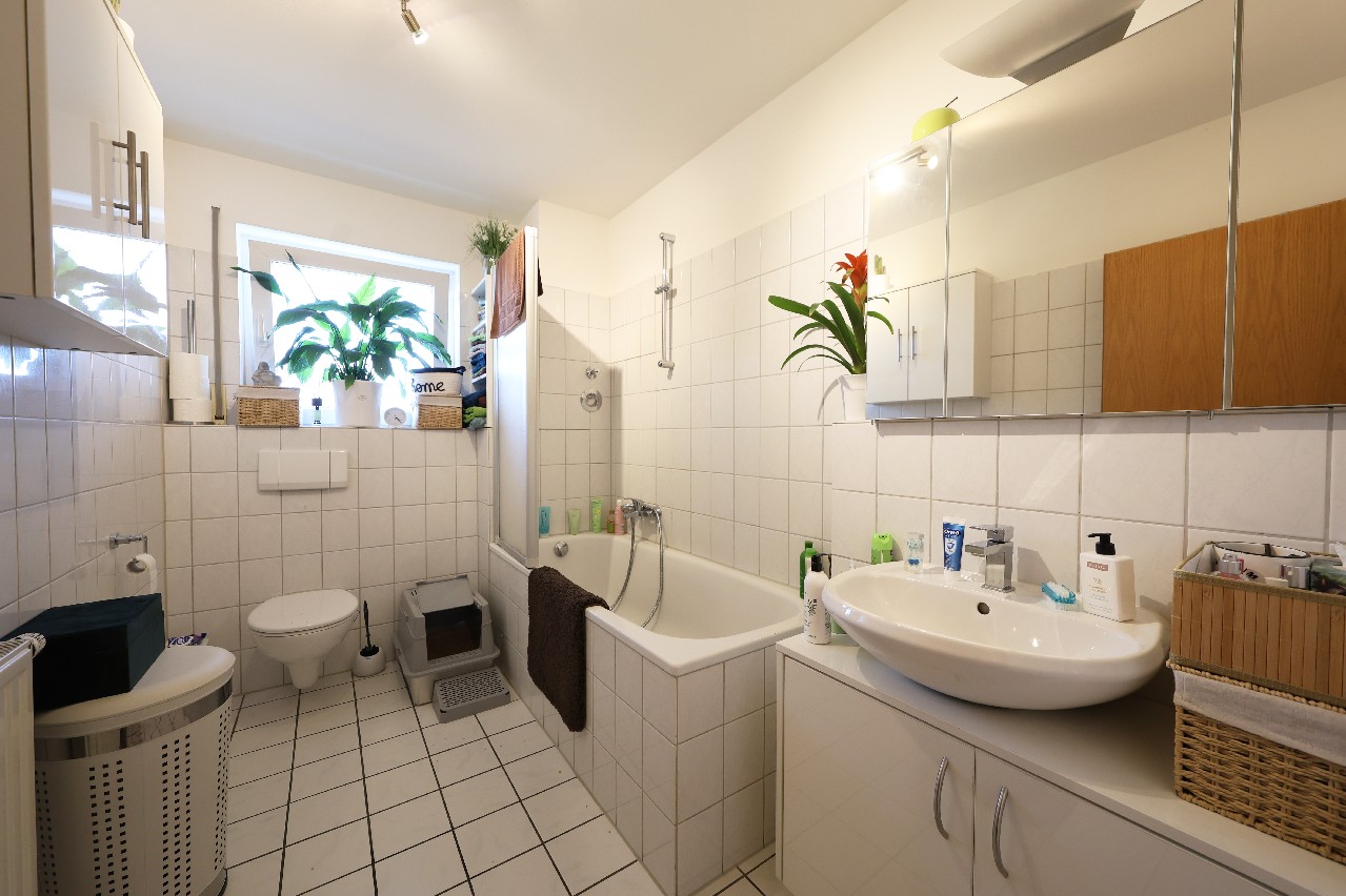 Das modern ausgestattete Wannenbad verfügt über ein Fenster, welches für angenehmes Tageslicht und eine natürliche Belüftung sorgt. Die helle Gestaltung unterstreicht den freundlichen Gesamteindruck und bietet hohen Komfort für den täglichen Gebrauch.
