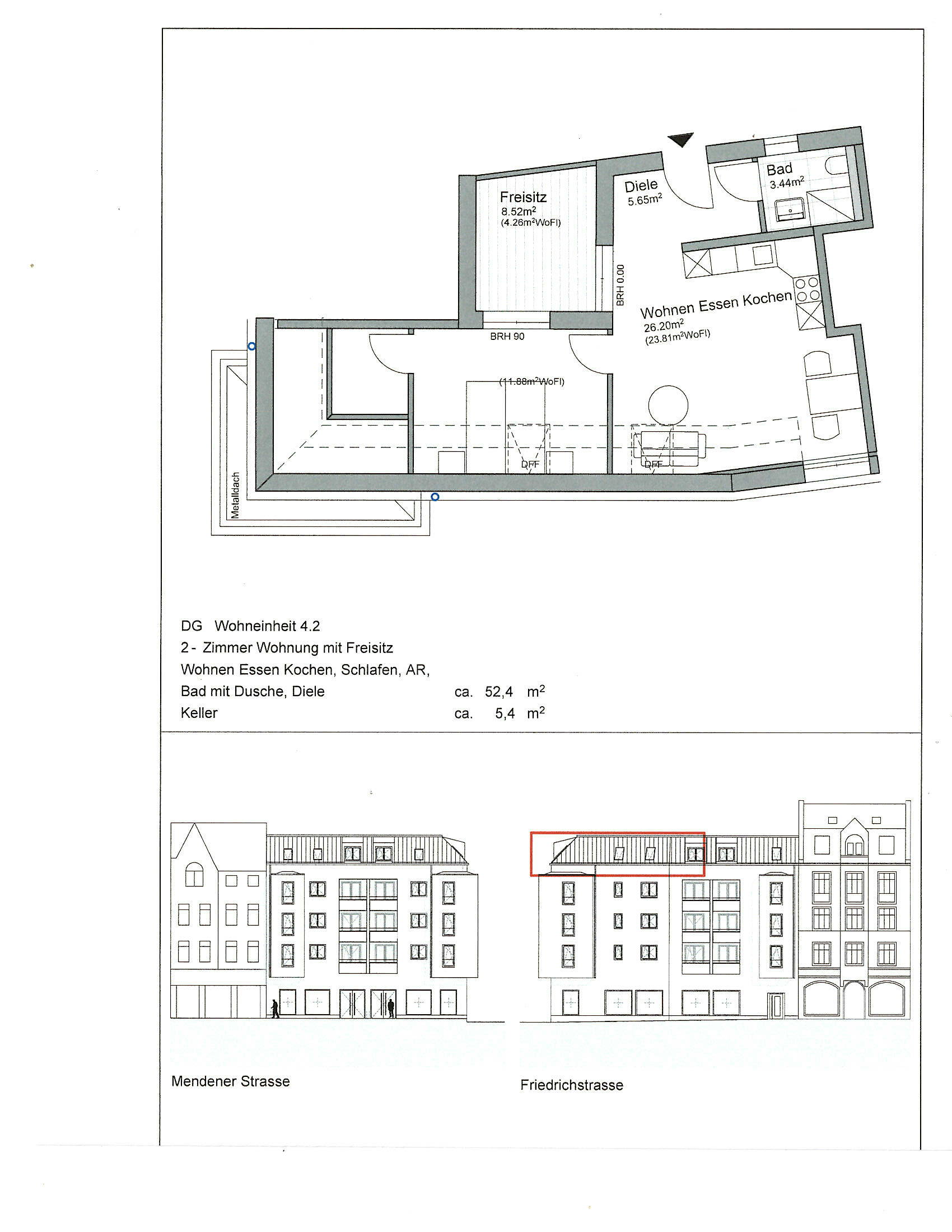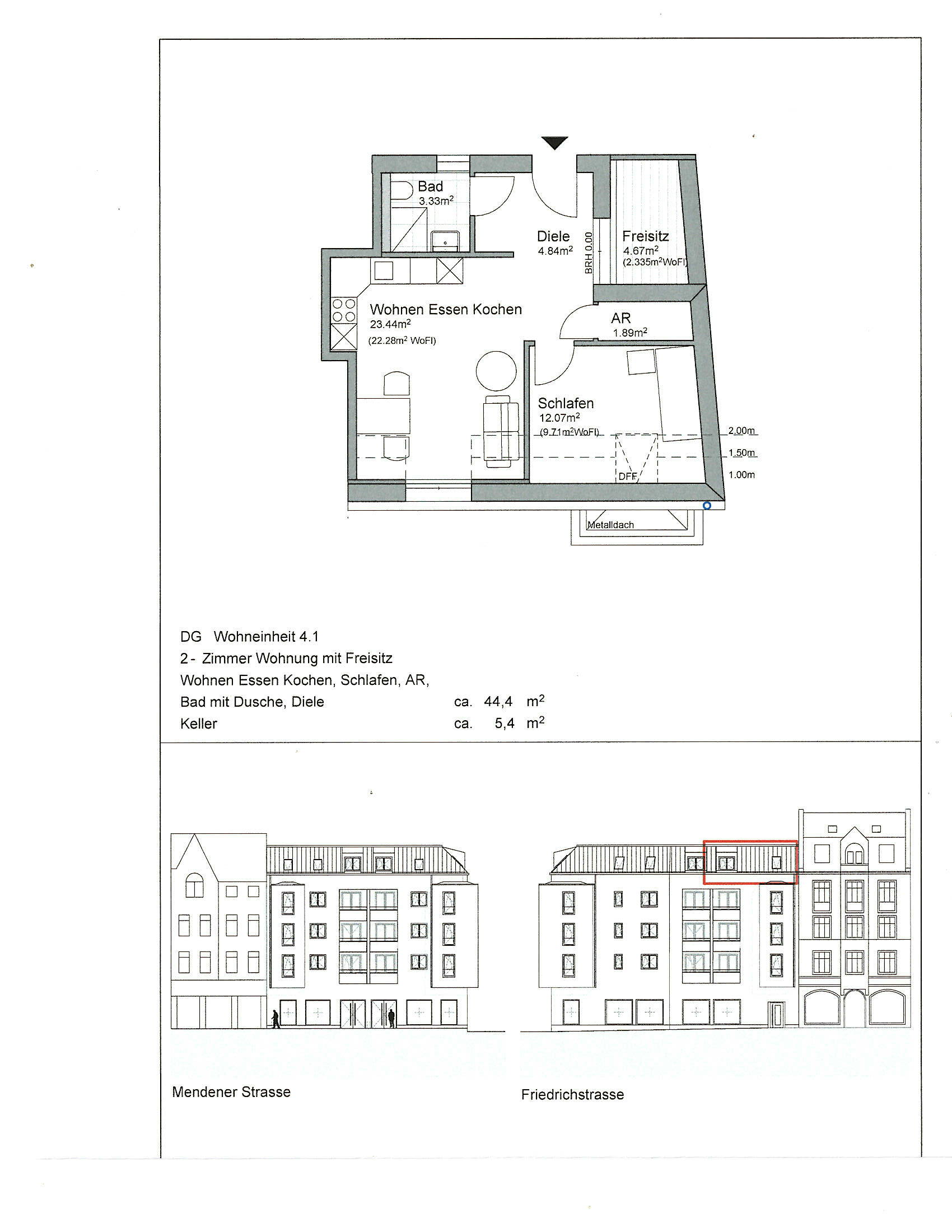 Willkommen in Ihrer neuen Traumwohnung im Herzen der Innenstadt von Iserlohn! Diese moderne 2-Zimmer Wohnung mit einer Wohnfläche von 62m² befindet sich in einem neu erbauten Wohn-Geschäftshaus. Dieses umfasst 4 Geschosse und 2 Gewerbeeinheiten im Erdgeschoss. Die Wohnung selbst befindet sich im 4. Obergeschoss und ist bequem über den Aufzug zu erreichen. Beim Betreten der Wohnung werden Sie sofort von einem großzügigen Wohn-Essraum empfangen. Hier können Sie Ihre Möbel ganz nach Ihrem Geschmack platzieren und Ihren individuellen Wohnstil verwirklichen. Angrenzend an den Wohn-Essraum befindet sich die offene Küche. Hier können Sie Ihre kulinarischen Fähigkeiten entfalten und Ihre Gäste mit köstlichen Gerichten verwöhnen. Der angrenzende Freisitz lädt zum Frühstücken oder gemütlichen Abendessen im Freien ein. Das separate Schlafzimmer bietet Platz für ein großes Bett und einen Kleiderschrank. Das moderne Badezimmer ist mit einer Dusche ausgestattet und bietet Ihnen alles, was Sie für Ihre tägliche Körperpflege benötigen. Die Wohnung ist leer und somit können Sie Ihrer Kreativität freien Lauf lassen und die Räume ganz nach Ihren Wünschen gestalten. Die hochwertige Ausstattung und die modernen Materialien sorgen für ein angenehmes Wohngefühl und verleihen der Wohnung einen eleganten Charme. Bitte beachten Sie, dass es in dem Gebäude keinen PKW Stellplatz gibt. Diese 2-Zimmer Wohnung mit Freisitz bietet Ihnen alles, was Sie für ein komfortables und modernes Wohnen benötigen. Die zentrale Lage, die hochwertige Ausstattung und die großzügige Wohnfläche machen diese Wohnung zu einem echten Highlight. Es stehen auf dieser Etage noch 2 weiter Wohnungen mit 44,4 m² und 52,4 m²zur Vermietung. Die Miete beträgt auch hier 12 EUR / m² zuzüglich Betriebskosten 2,50 EUR /m² und Heizkosten 0,50 Cent/ m².