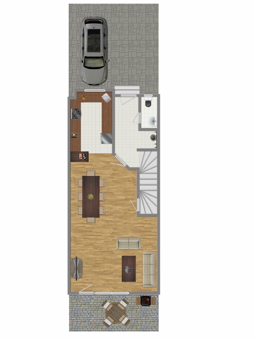 • Nach Betreten des Gebäudes befindet sich links das Gäste-WC und im Anschluss die Garderobe. Folgen Sie der Diele weiter so gelangen Sie in den großen Wohn-Essbereich mit angrenzender, offen gestalteter Küche (inkl. Einbaumöbel und Markengeräten). Ebenfalls können Sie vom Wohnbereich aus Ihre Terrasse und den kleinen Garten betreten, welcher mit einem Gartenhäuschen ausgestattet ist. Über ein Gartentor kann man den Garten zudem betreten oder verlassen. Die Terrasse verfügt über eine Markise.