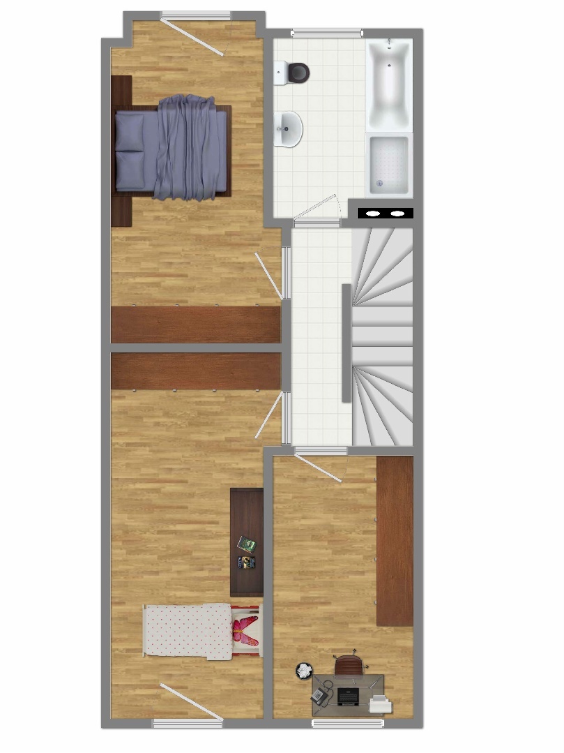 Über die Treppe gelangen Sie in das Obergeschoss, welches insgesamt drei Schlafzimmer und ein Tageslichtbadezimmer samt WC, Waschtisch, Dusche und Wanne umfasst. Die Schlafzimmer sind allesamt mit hochwertigem Korkboden ausgestattet.