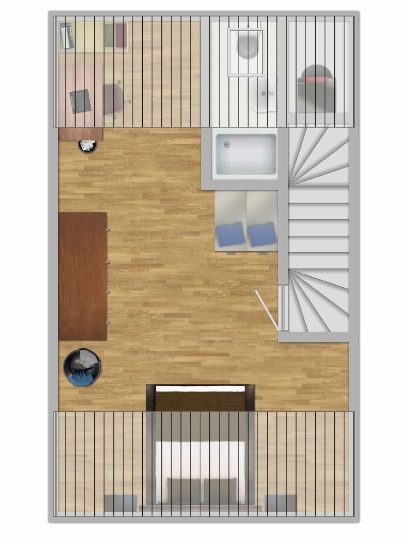 Der Studioraum erstreckt sich über das gesamte Dachgeschoss ist überzeugt insbesondere durch eine hohe Raumhöhe. Von diesem Raum aus lässt sich ebenfalls ein Tageslichtbadezimmer betreten, welches mit WC, Waschtisch und Dusche ausgestattet ist. Das Haus ist für bis zu 5 Personen geeignet.