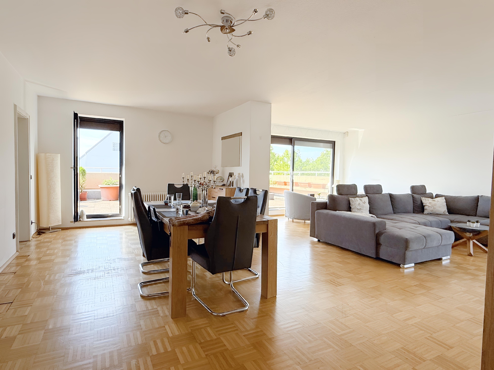 Das Highlight dieser Wohnung sind definitiv die große Dachterrasse und der zweiseitig umlaufende Balkon. Beide sind von nahezu allen Räumen über bodentiefe Fenster, welche zudem für einen tollen Tageslichteinfall sorgen, begehbar.