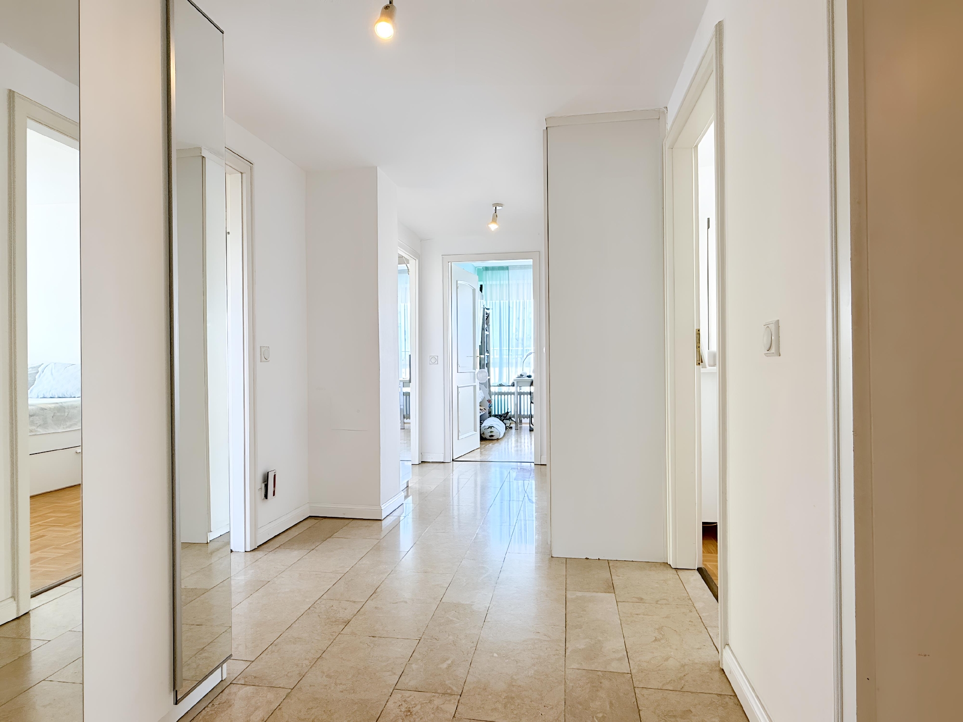 Das Vollbad sowie die vier Schlafzimmer befinden sich in dem vom Wohnraum abgewandten Bereich, auf der rechten Seite der Wohnung. Drei der Zimmer haben einen direkten Zugang zum Balkon und bieten einen schönen Blick in die Baumkronen.