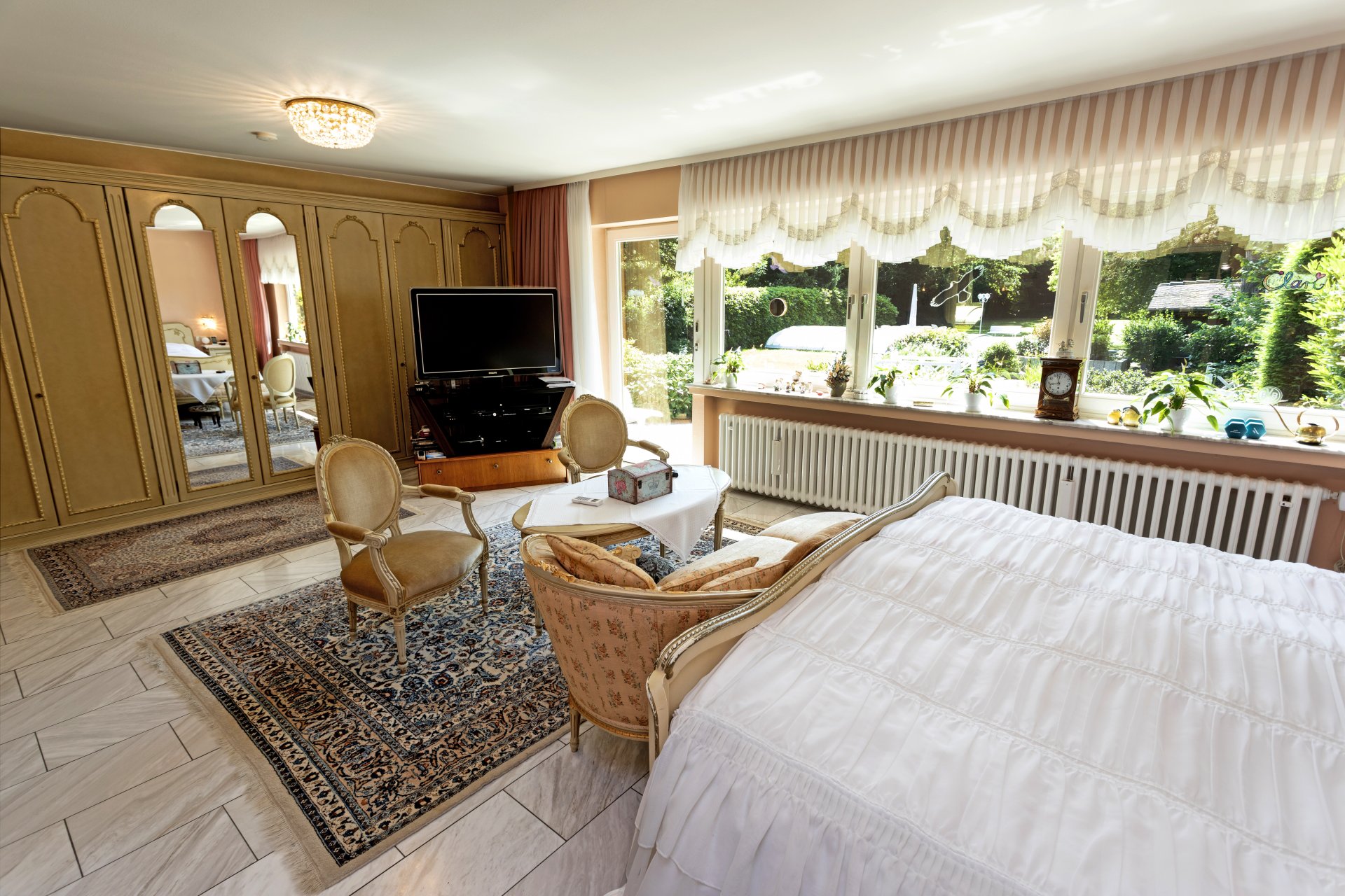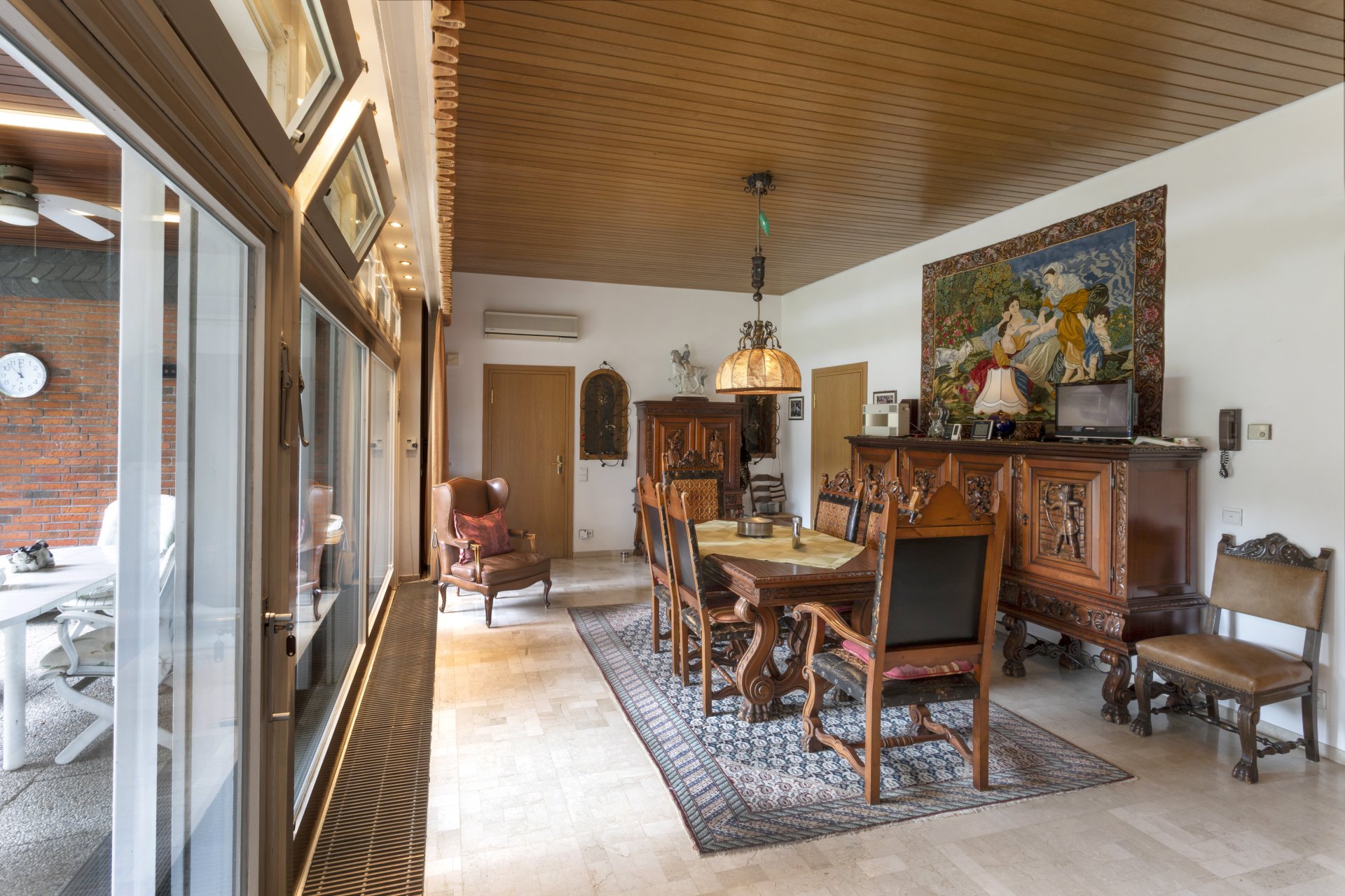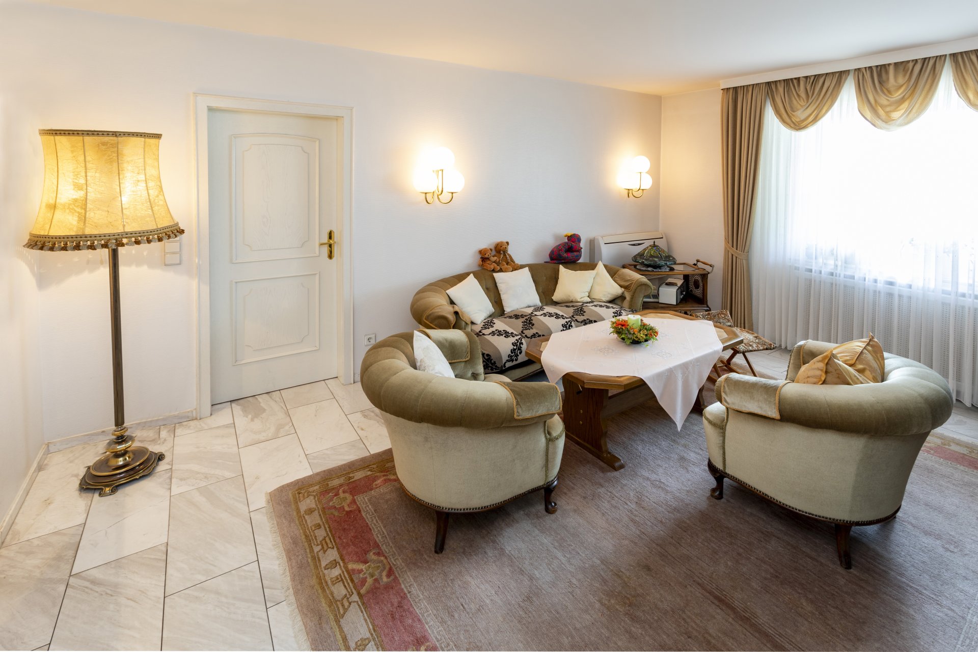 Bodenbeläge: Haupthaus: Eingangsbereich, aktueller Wohn-/ und Essbereich mit hochwertigen Natursteinen, Küche und Bad gefliest, separate Einliegerwohnung: Flur, G-WC, Küche und ein Raum gefliest, zwei weitere Zimmer durchgehend Marmor; Dachgeschoss: Bäder gefliest, ansonsten Eichenparkett.