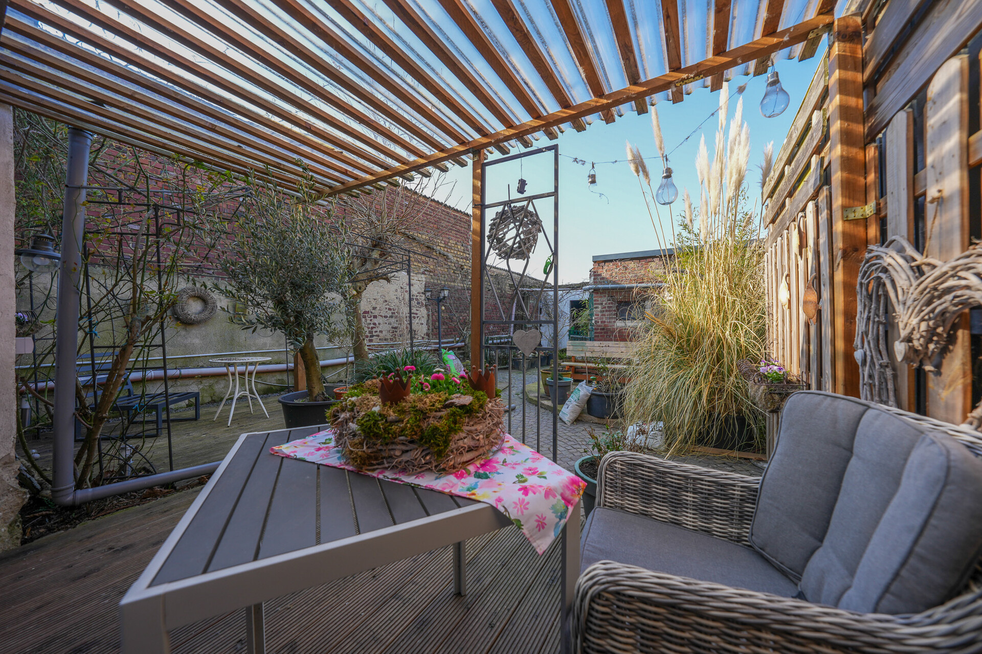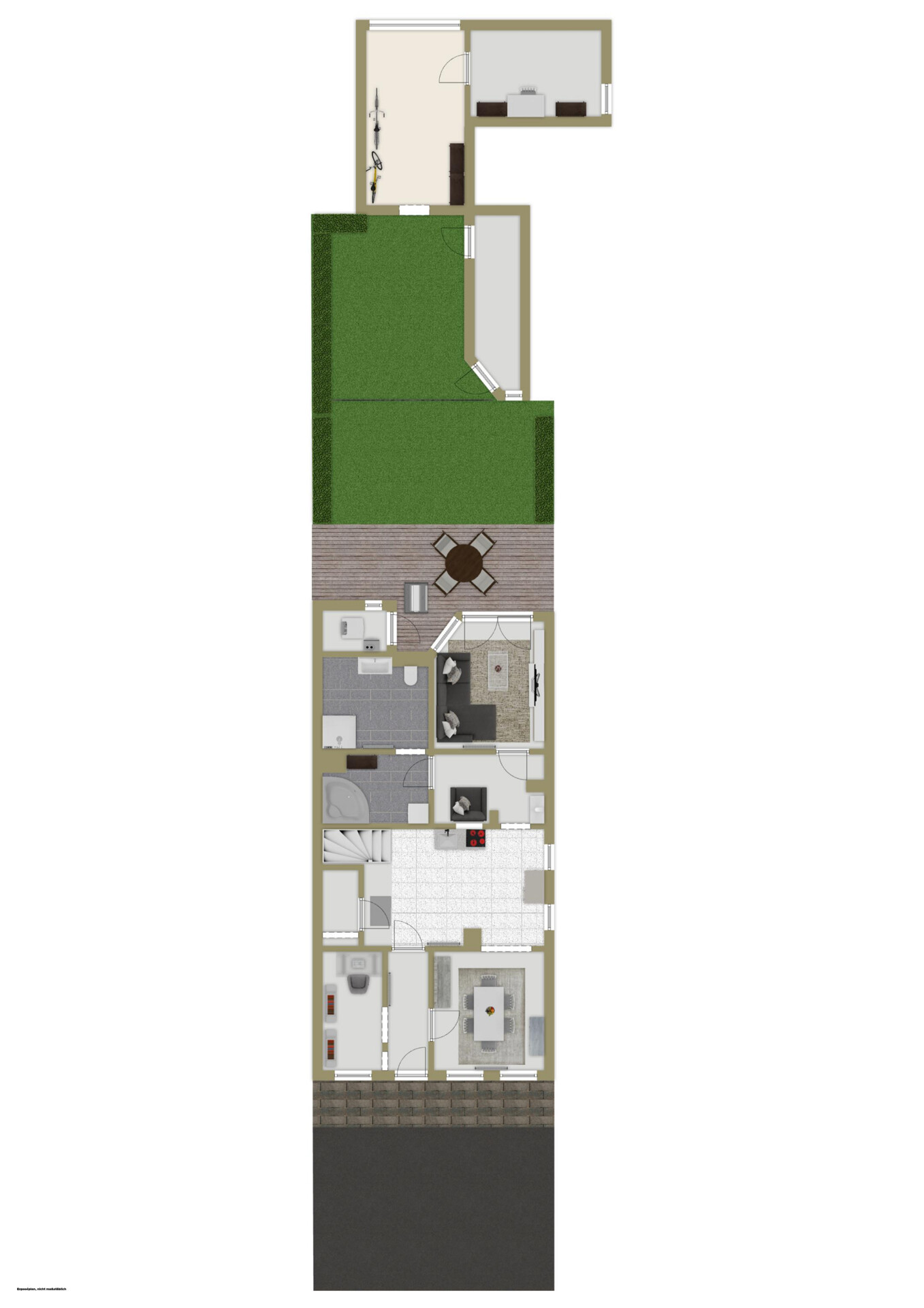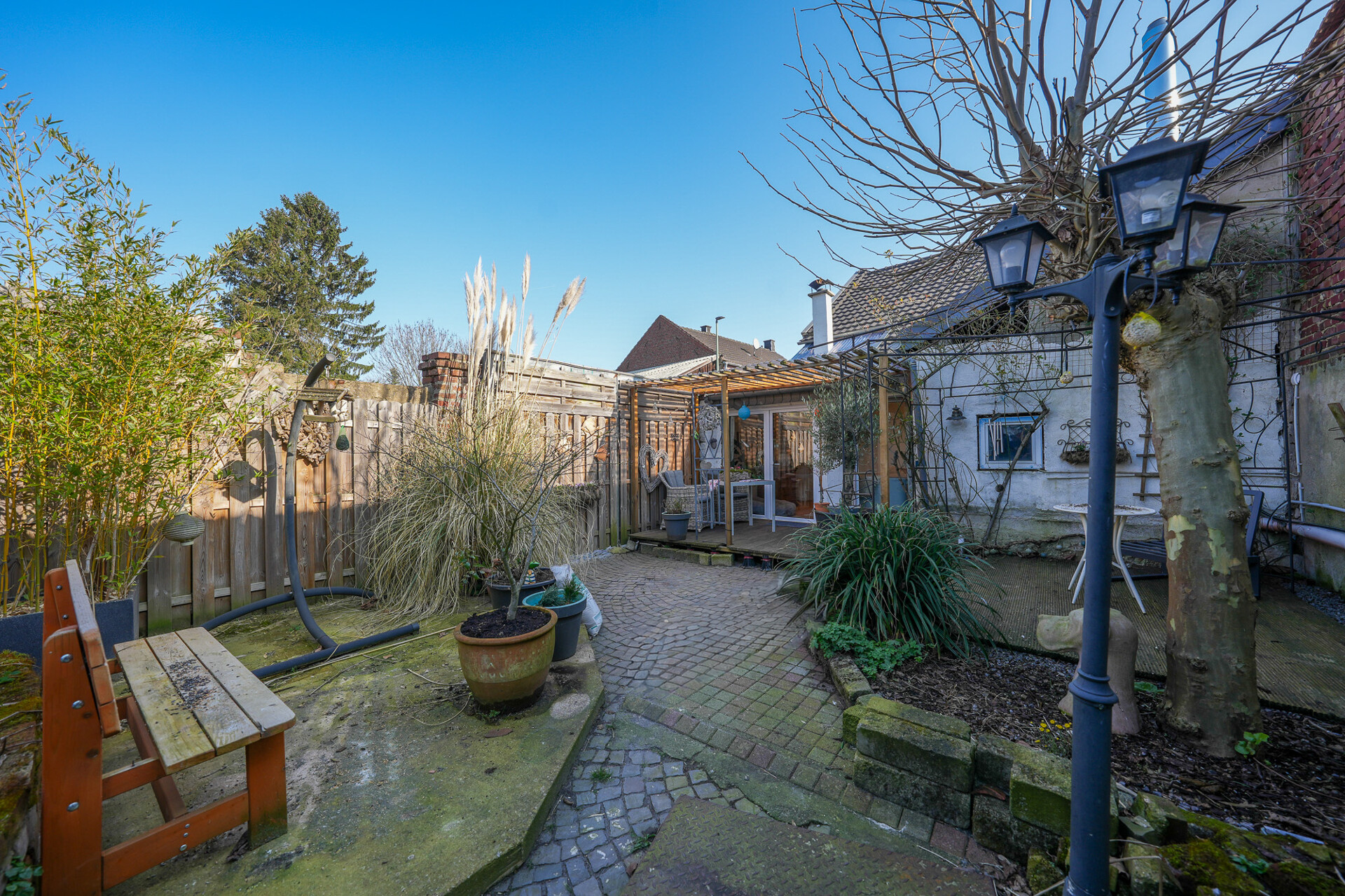 Der Gartenbereich ist überwiegend gepflastert und damit besonders pflegeleicht. Er eignet sich ideal für gemütliche Freiluftaktivitäten, Stellflächen für Gartenmöbel oder als Erweiterung des Wohnbereichs im Sommer. Die angrenzende Terrasse bietet zusätzlich einen einladenden Platz zum Entspannen im Freien.