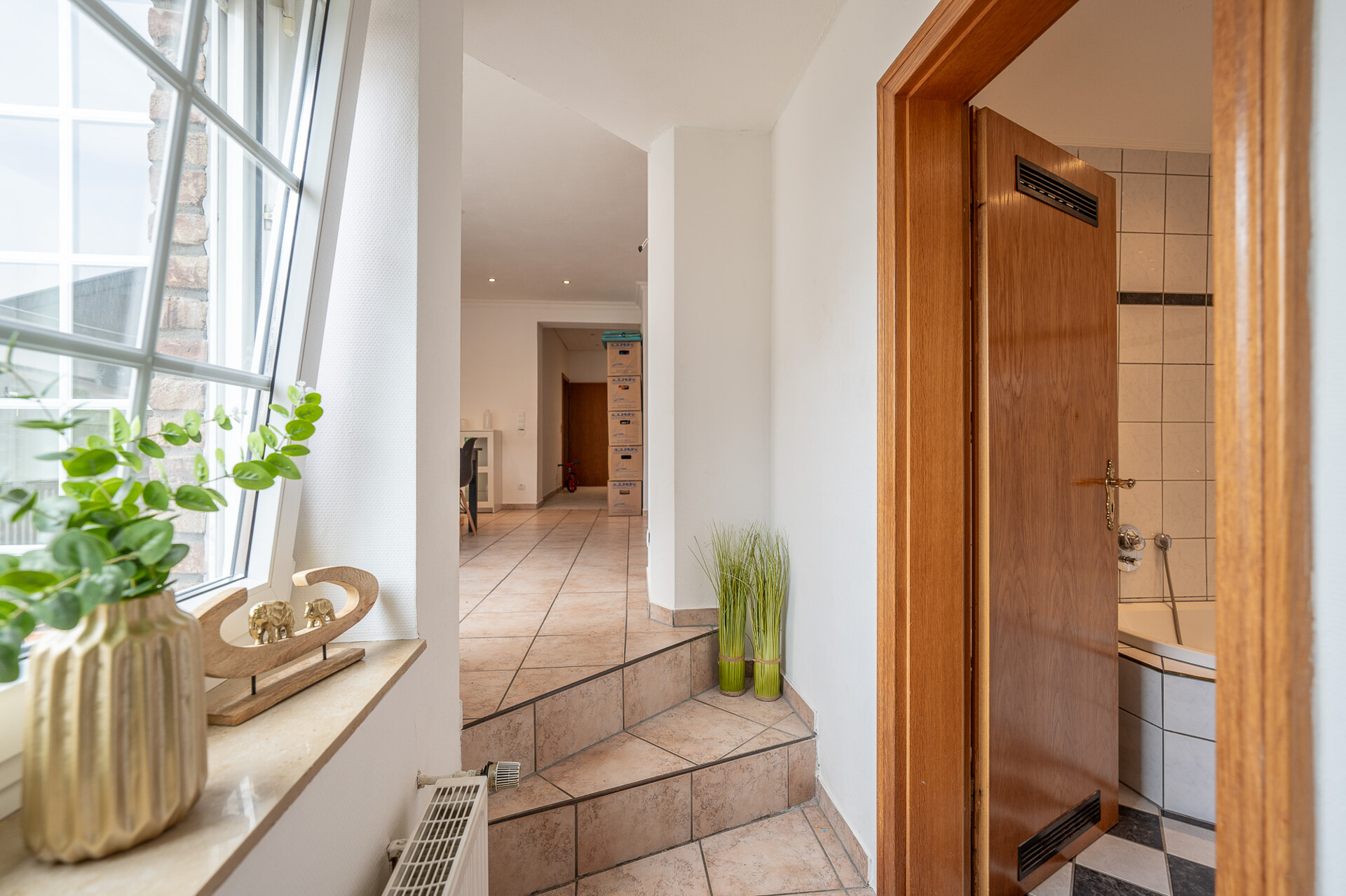 Die Obergeschosswohnung erstreckt sich über zwei Etagen und beeindruckt durch eine durchdachte Raumaufteilung. Im 1. Obergeschoss betreten Sie die Wohnung direkt in die offene Küche mit angrenzendem Wohn- und Essbereich. Von der Küche aus haben Sie direkten Zugang zum Balkon – ideal für sonnige Frühstücke oder gemütliche Abende im Freien. Das Badezimmer ist ebenfalls mit Badewanne und Dusche ausgestattet. Im Dachgeschoss befinden sich drei weitere, flexibel nutzbare Zimmer sowie ein kleines Bad mit Dusche, die vielseitige Nutzungsmöglichkeiten für Familie, Hobby oder Arbeitsbereiche bieten.