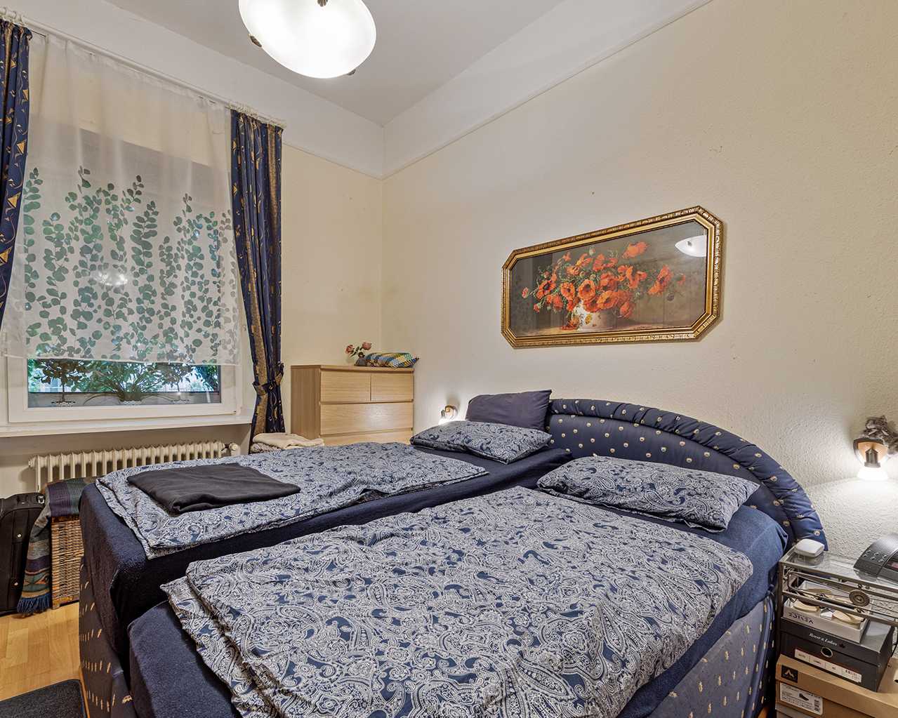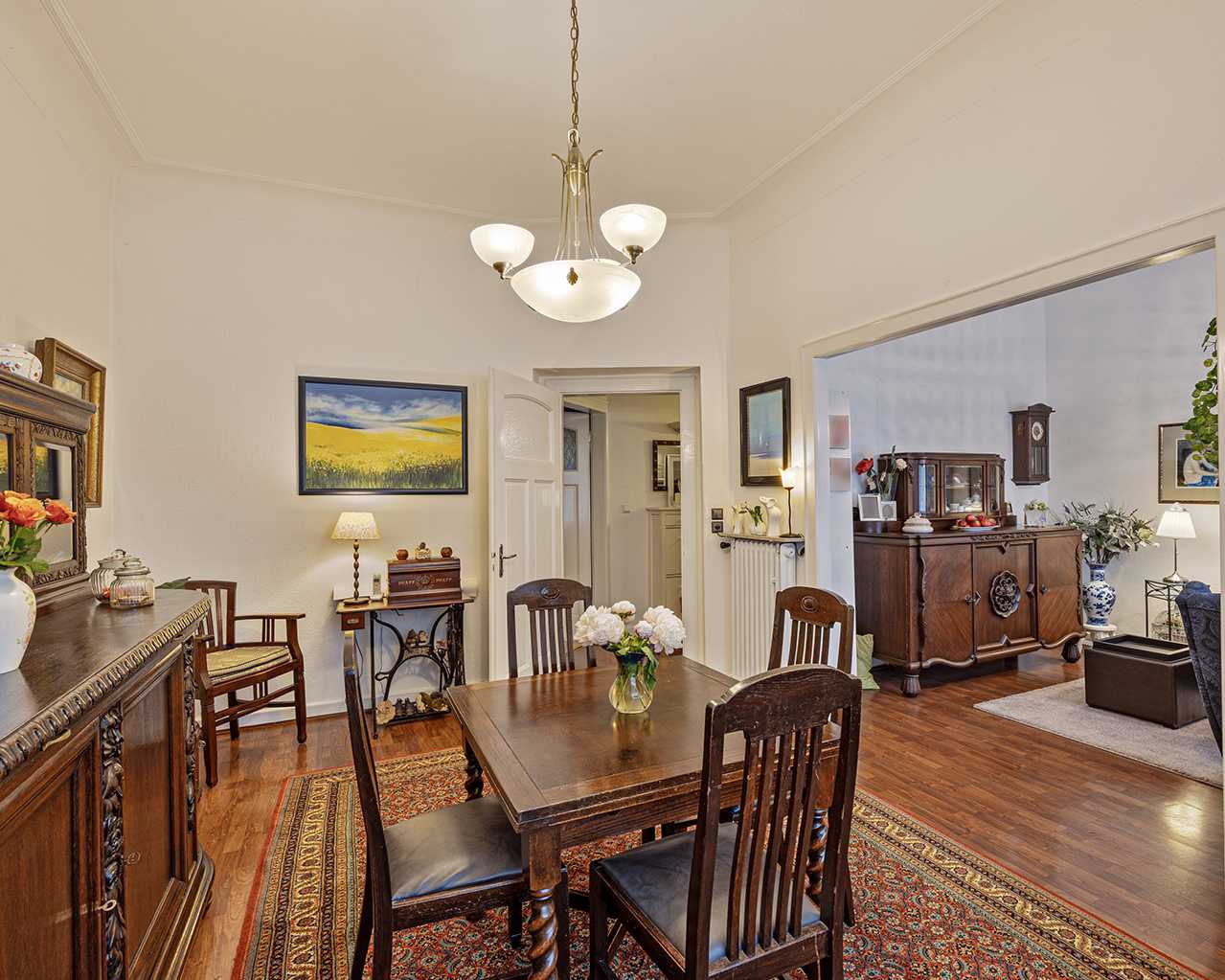 Bereits beim Betreten der zentralen Diele vermittelt die Wohnung den baujahrstypischen Altbaucharme. Das Wohnzimmer ist mit dem Essbereich verbunden, sodass sich dieser großzügig gestaltete Bereich als Mittelpunkt der Wohnung bezeichnen lässt. Das geräumige Schlafzimmer und das Arbeits-/Gästezimmer befinden sich im hinteren Teil der Wohnung. Das Badezimmer und die geräumige Küche befinden sich zur Rückseite des Gebäudes.