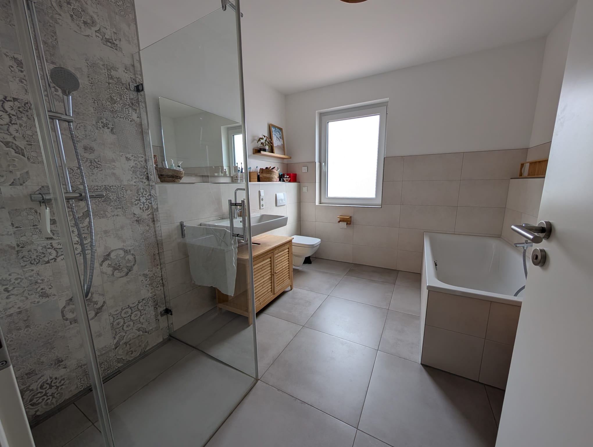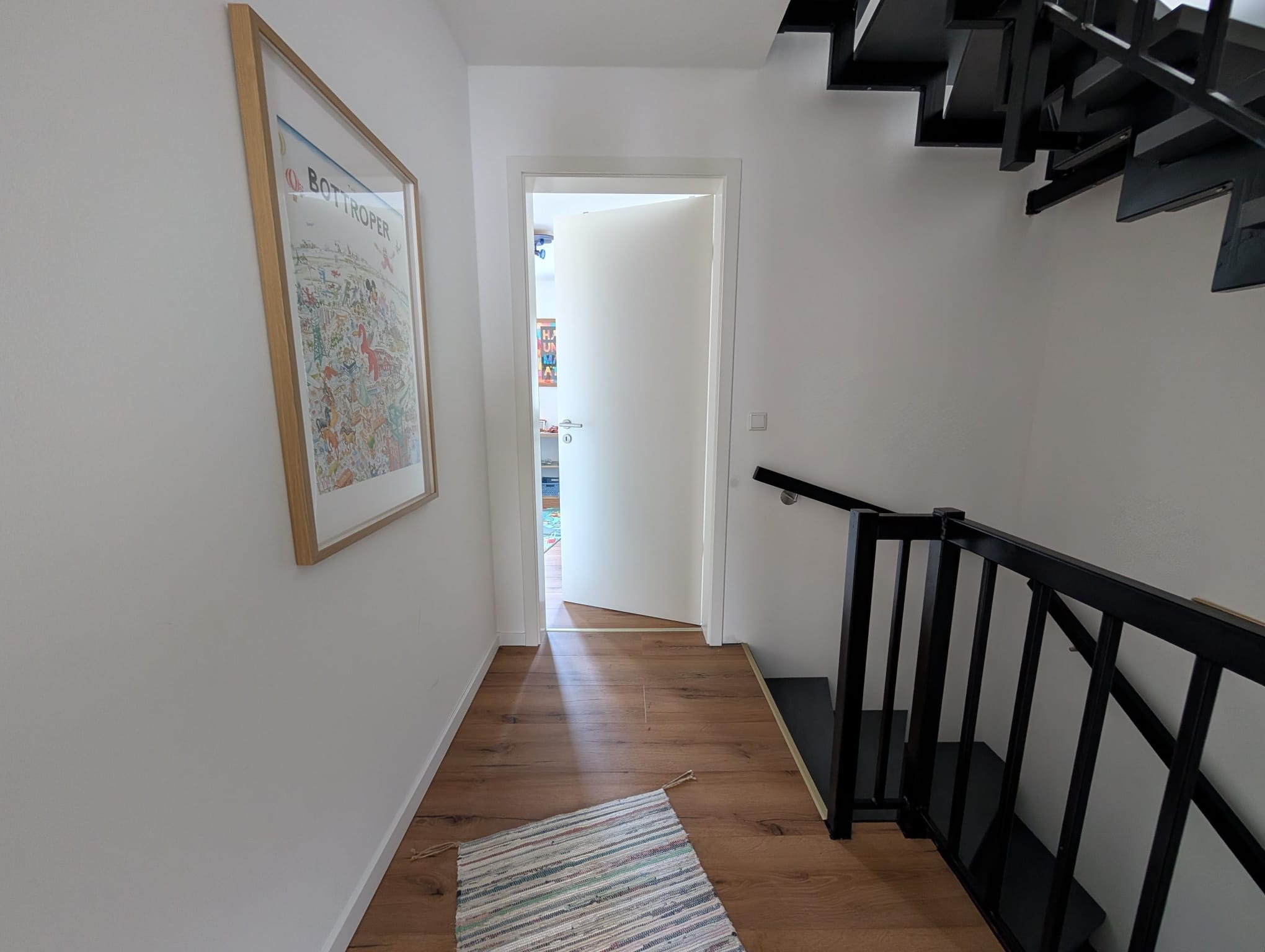 Über die hochwertige Stahlsystemtreppe mit komplett spiegelbildlichem Treppenlauf gelangen Sie in I. Obergeschoss. Hier erwarten Sie zwei Schlaf-/Kinderzimmer und ein großes, luxuriöses Wannen-Duschbad mit Tageslicht.