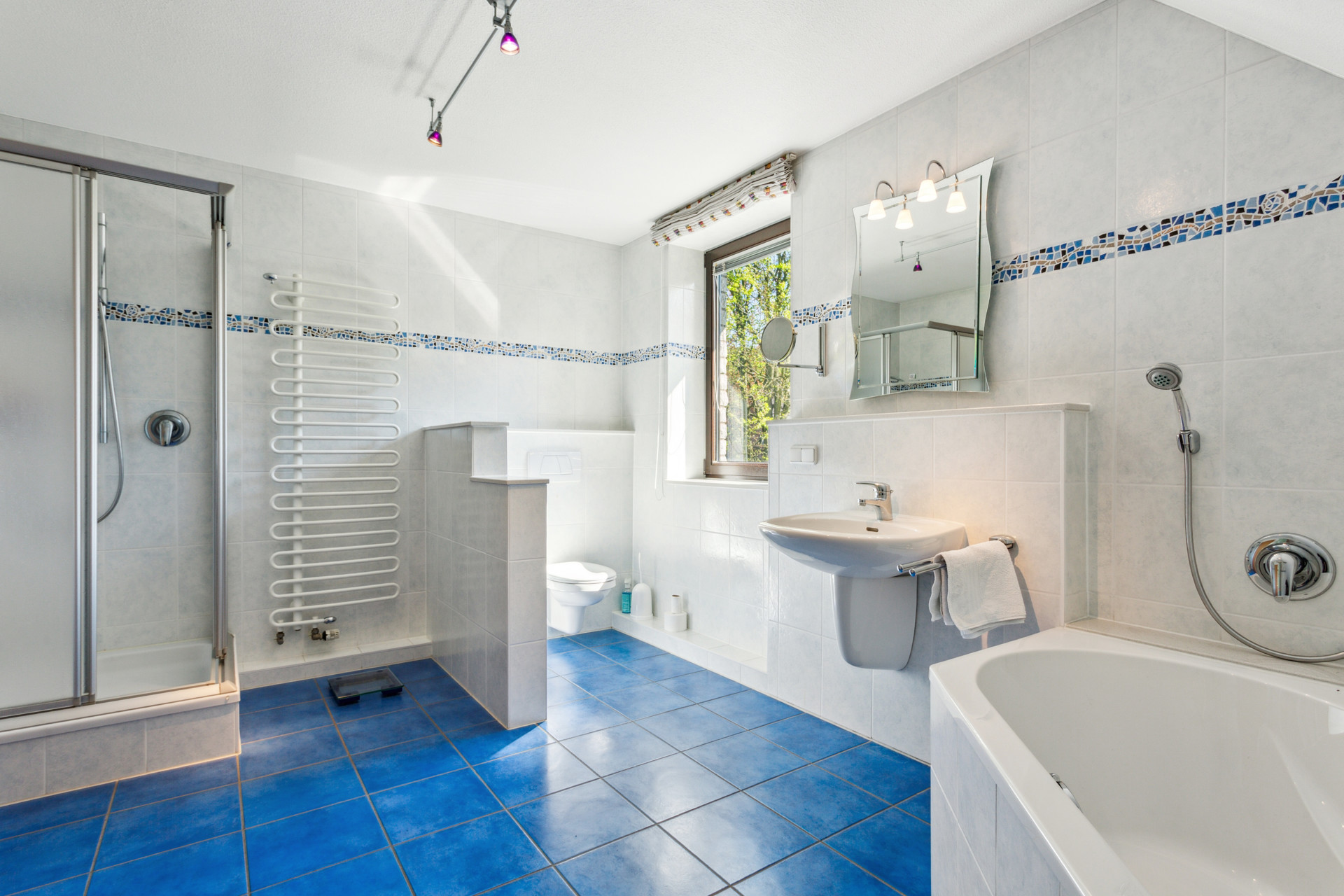 Im Obergeschoss stehen drei Schlafzimmer zur Verfügung, die jeweils über einen eigenen Zugang zu einem Badezimmer verfügen. Ein seltener Komfort, der den Wohnwert deutlich erhöht. Zusätzlich ist ein Ankleidezimmer vorhanden, das an eines der Schlafzimmer anschließt.