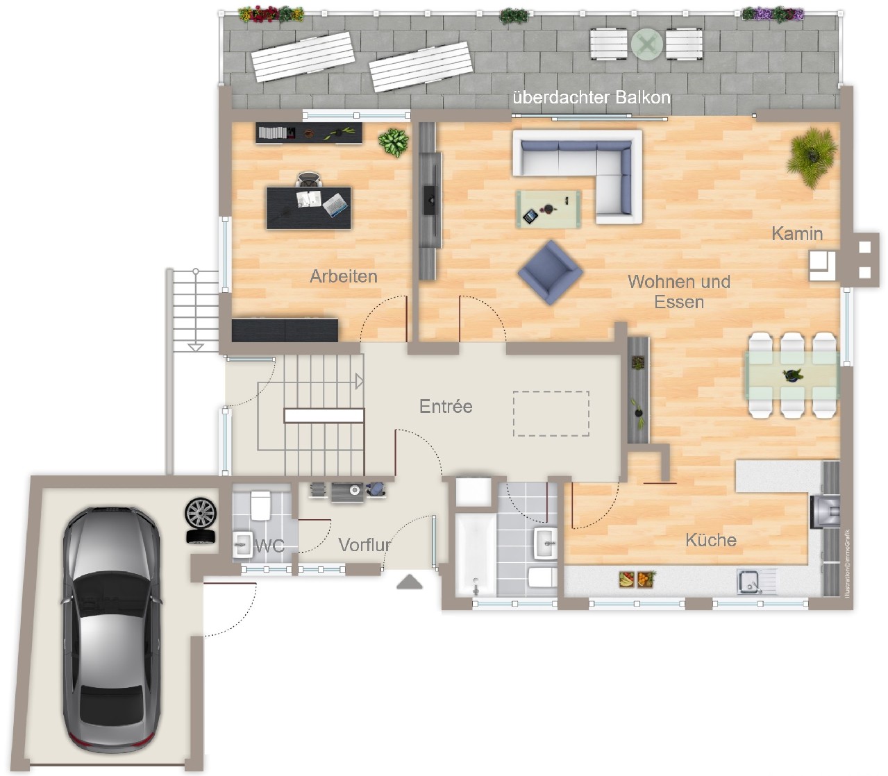 Auf rund 162 m² Wohnfläche öffnet sich eine Raumstruktur, die nicht laut sein muss, um Wirkung zu zeigen. Der offen gestaltete Wohn- und Essbereich fließt harmonisch in die Küche über, schafft Weite und Kommunikation – und wird durch einen Kaminofen im Wohnbereich zum atmosphärischen Mittelpunkt. Von hier aus führt ein großer Balkon mit freiem Blick in den gepflegten Garten. Die Verbindung von innen und außen ist spürbar – nicht spektakulär, sondern selbstverständlich.