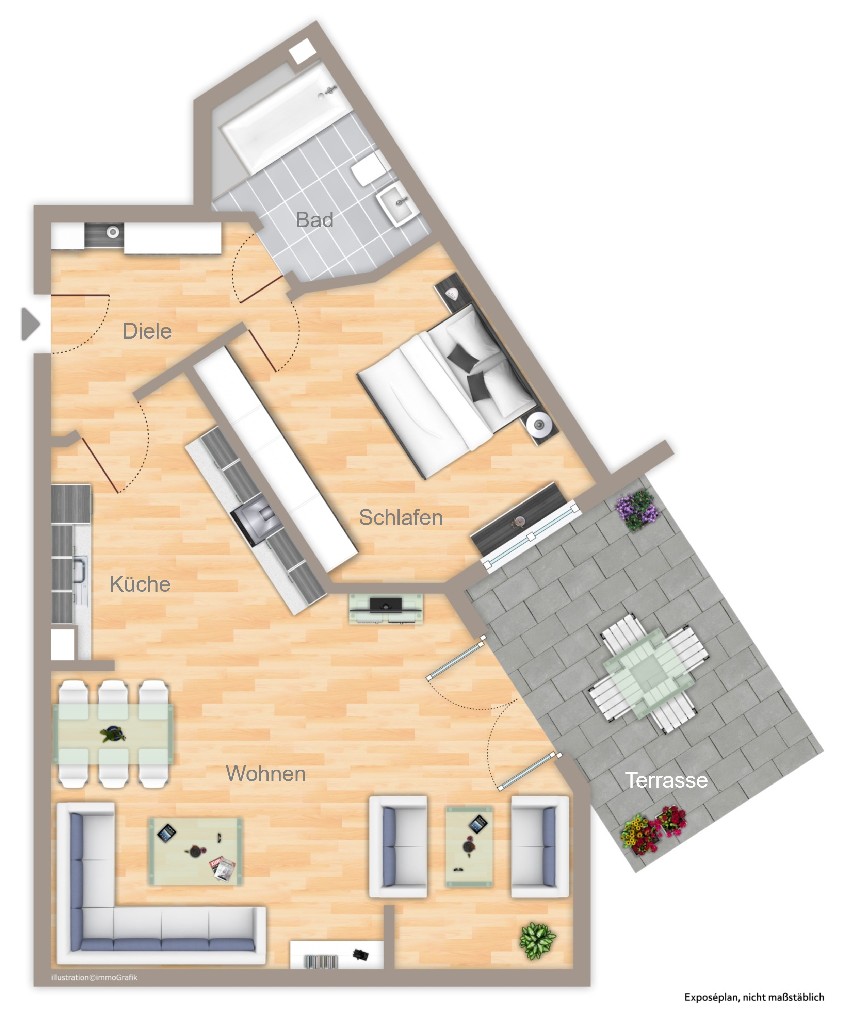 Mit einer Wohnfläche von ca. 59 m² bietet sie ideale Voraussetzungen für eine Einzelperson, die Wert auf eine überschaubare, gut strukturierte Wohnsituation legt. Der Wohn- und Essbereich ist offen gestaltet, die Küche ist harmonisch integriert und unterstützt den zeitgemäßen Charakter der Wohnung. Von hier aus besteht Zugang zur Terrasse, die einen ruhigen Rückzugsort im Freien bietet. Das Schlafzimmer ist funktional geschnitten und bietet ausreichend Platz für Schlaf- und Stauraummöbel. Das Badezimmer ist modern ausgestattet und verfügt über eine Badewanne.