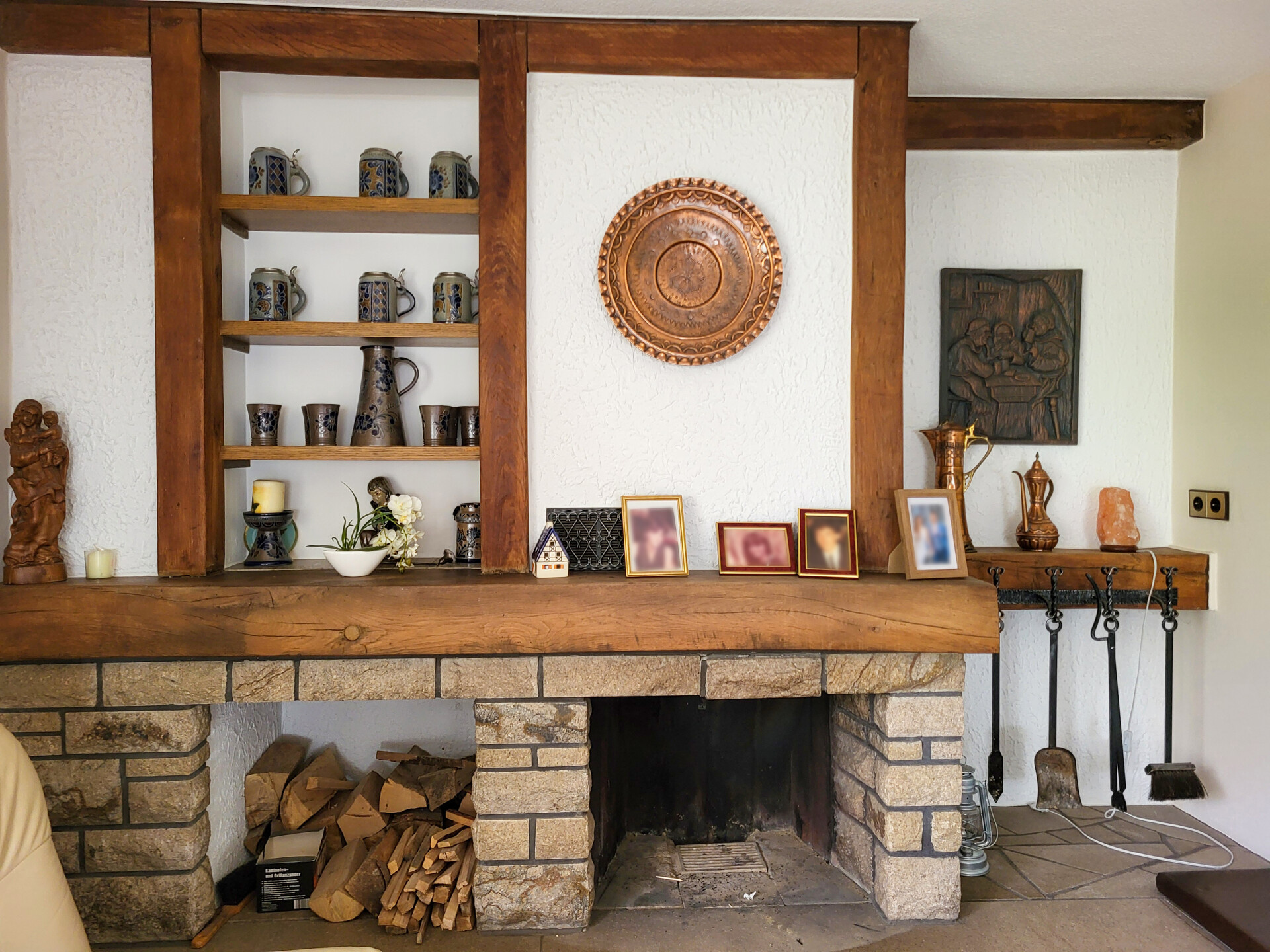 Im Erdgeschoss befinden sich die Küche, das große Wohn-/Esszimmer mit Kamin und Zugang zur überdachten Terrasse sowie ein Badezimmer.