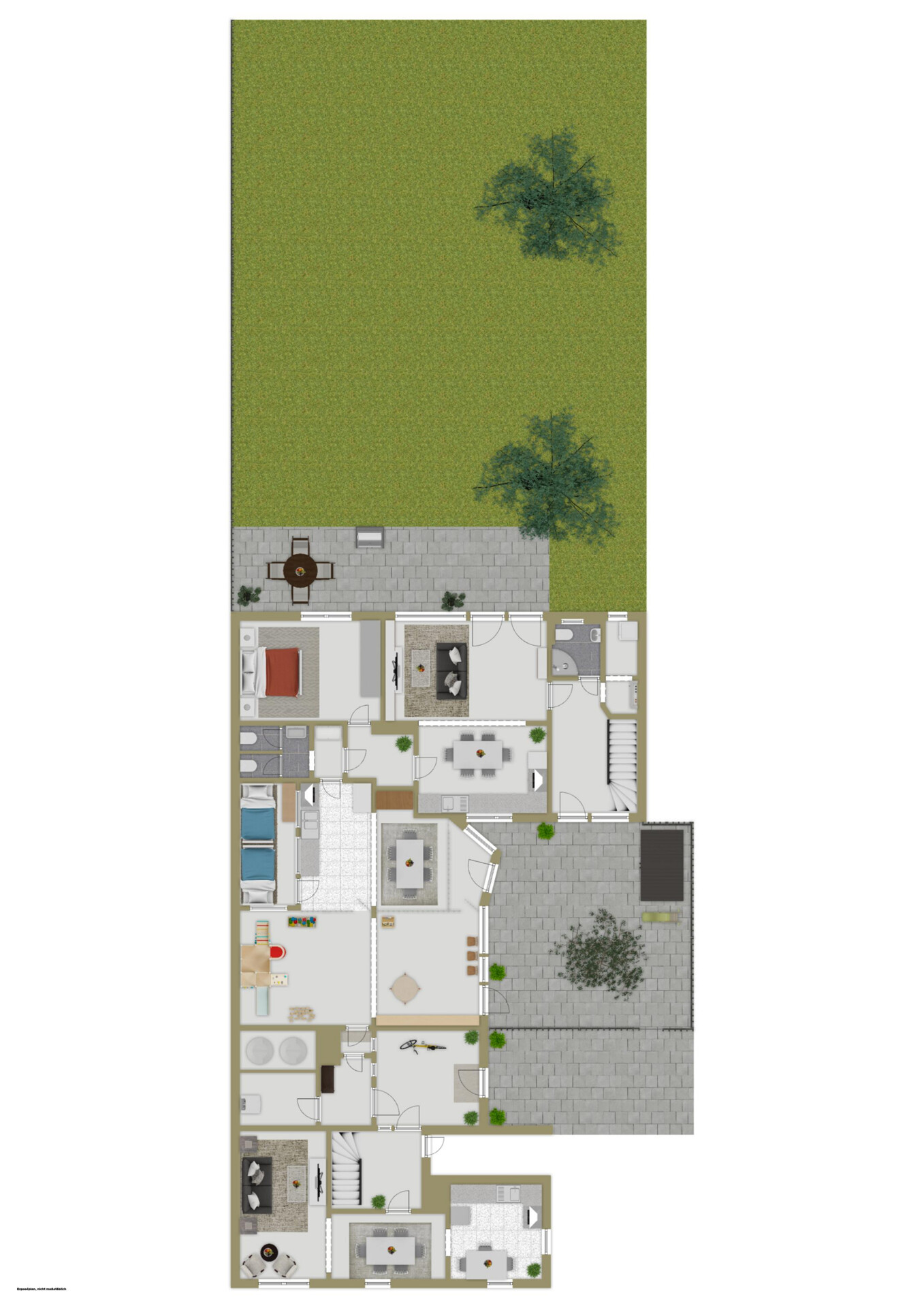 Besonders charmant ist die dazwischenliegende Kindertagesstätte mit ca. 77 m² Nutzfläche. Sie verfügt über Schlaf- und Spielbereiche und ist ideal für gewerbliche Nutzung – eine Seltenheit, die diese Immobilie so einzigartig macht.