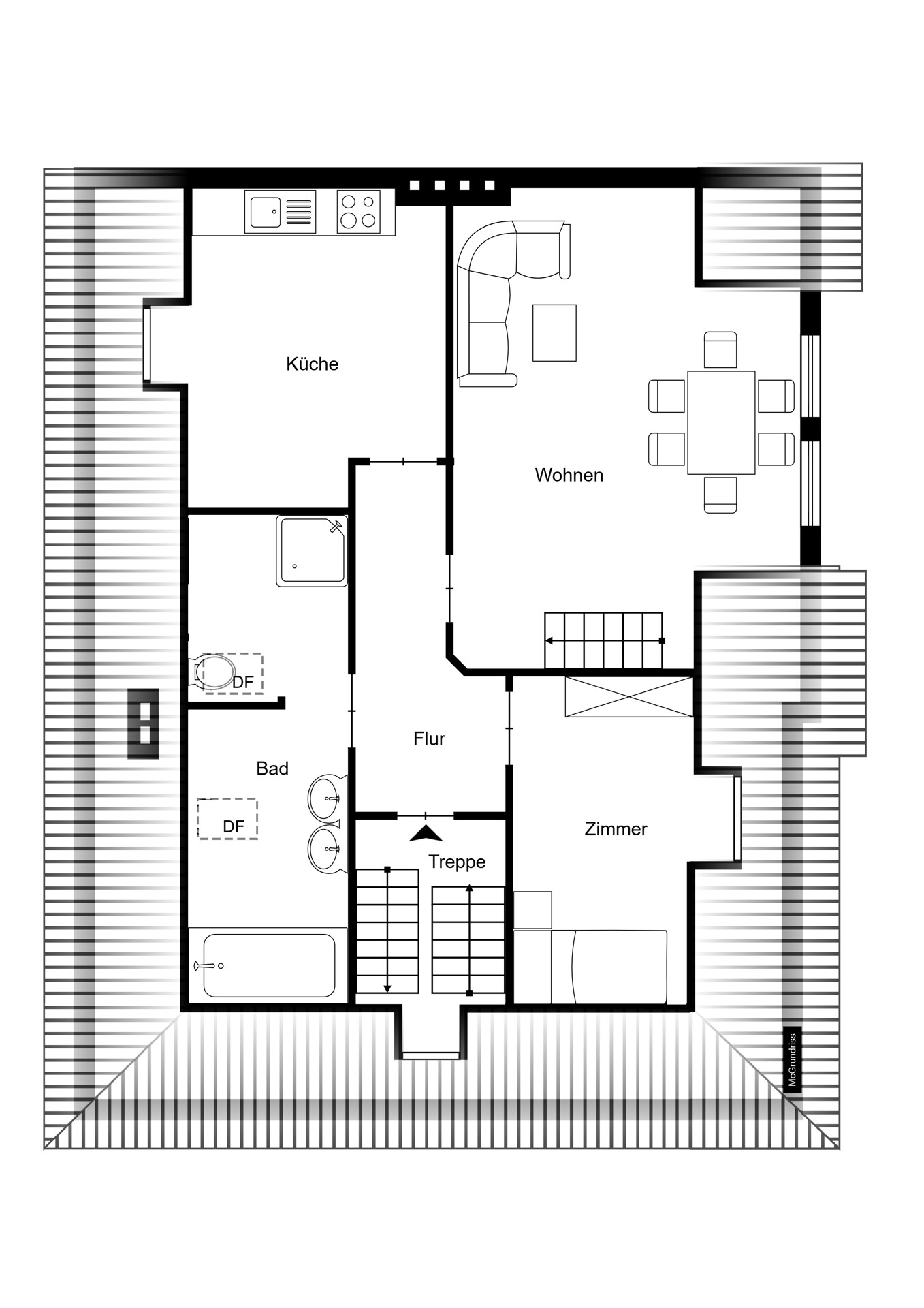 Im Dachgeschoss befindet sich eine bereits teilgenehmigte Wohnung. Der Ausbau überzeugt durch ein großzügig geschnittenes Wohnzimmer sowie ein Schlafzimmer. Darüber hinaus besteht Zugang zum bereits ausgebauten Spitzboden, der sich ideal als Hobbyraum oder zusätzlicher Stauraum nutzen lässt. Das geräumige Badezimmer ist mit Dusche und Badewanne ausgestattet. Eine separate Küche komplettiert das Raumangebot dieser besonderen Wohneinheit.