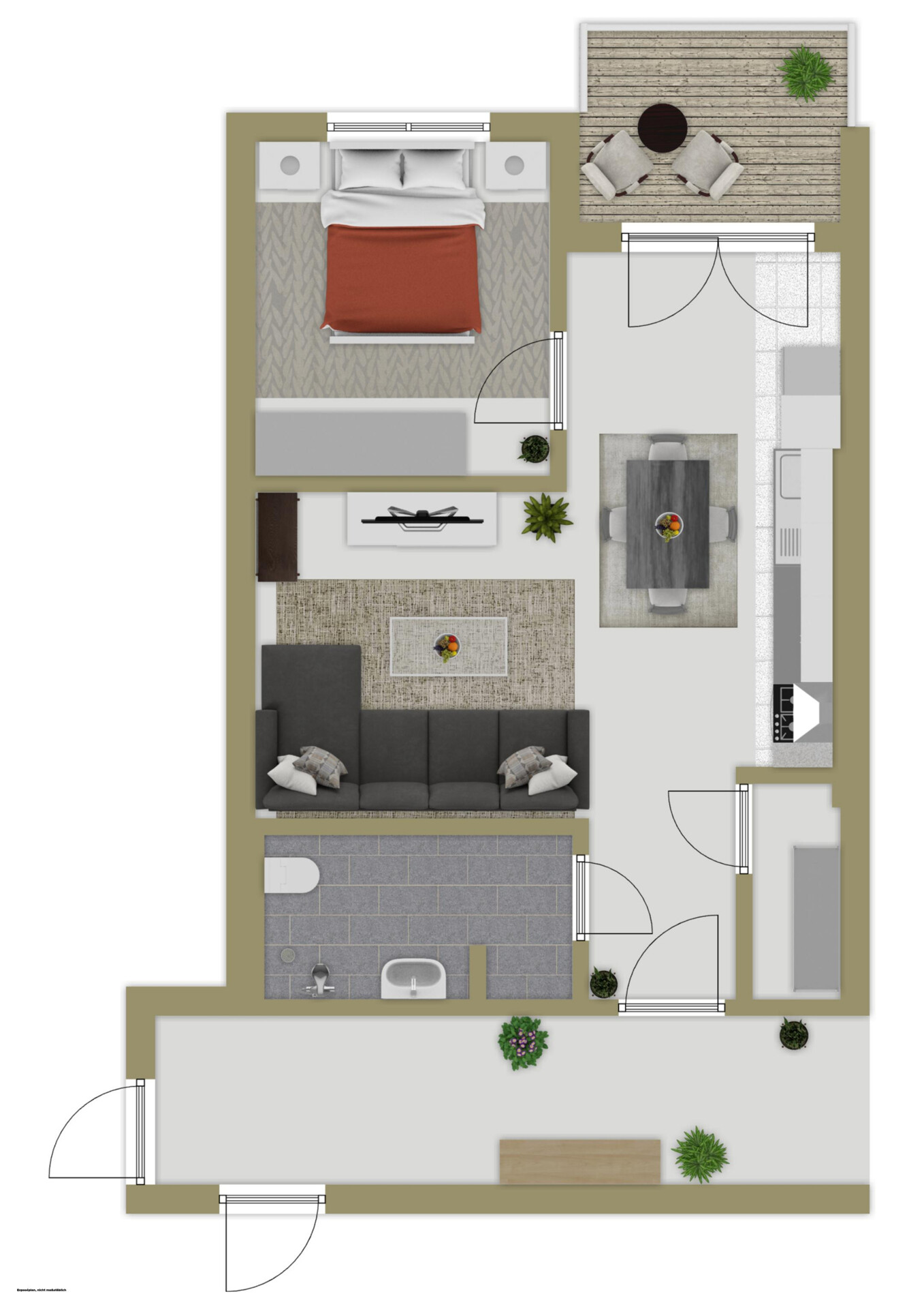 Durchdachter Grundriss: Ca. 49 m² Wohnfläche mit offenem Wohn-, Ess- und Kochbereich + ruhigem Schlafzimmer.