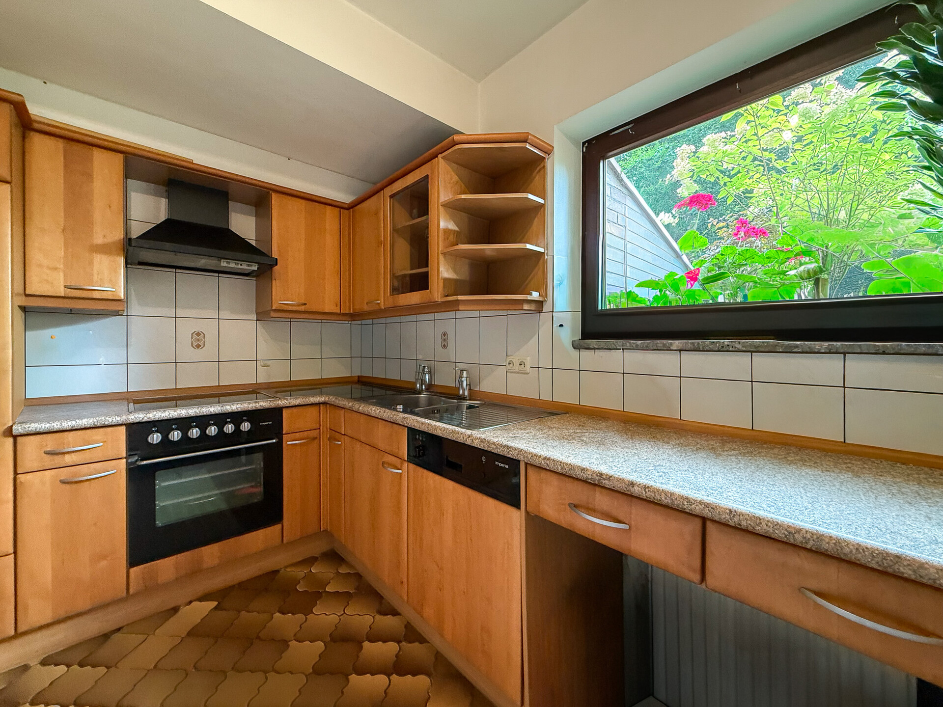 Beim Betreten des Erdgeschosses gelangt man über die Diele direkt in den offen gestalteten Wohn-, Küchen- und Essbereich, der dank hellen Fliesen und bodentiefer Fenster von Licht durchflutet wird und einen herrlichen Ausblick eröffnet. Die Holzbalken und Holzverkleideten Decken sorgen für ein Wohlfühlambiente. Im Wohnzimmer befindet sich außerdem eine großzügige Kaminecke, welche über drei Stufen erreicht werden kann und durch Fenster mit elektrischen Rollläden direkten Ausblick in den Garten bietet.