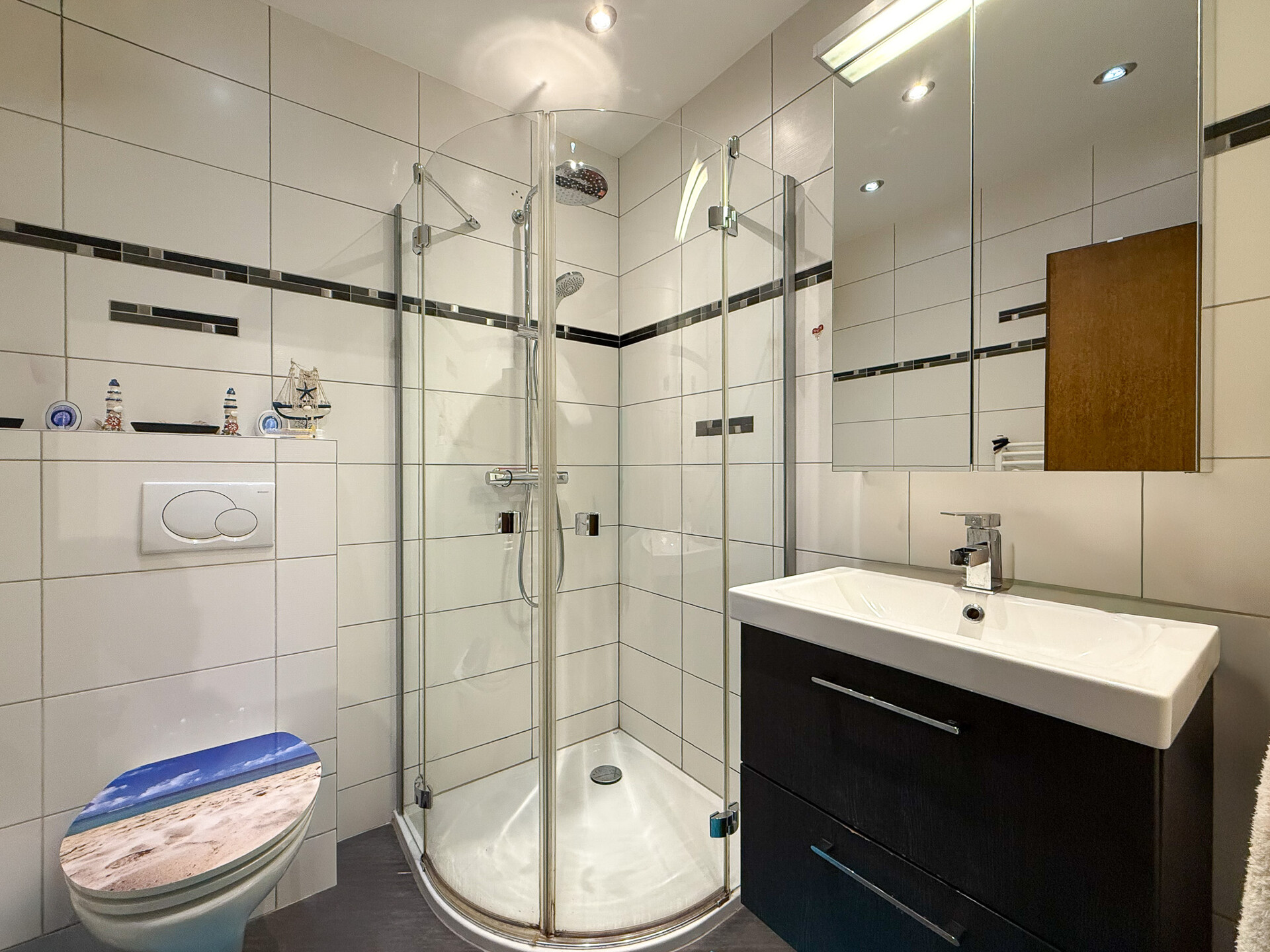 Vom Wohnzimmer aus besteht auch der Zugang zum Balkon, der zum Verweilen und Genießen einlädt. Dieser ist mit einer Markise ausgestattet. Das Schlafzimmer liegt gleich nebenan und bietet ebenfalls einen direkten Balkonzugang. Angrenzend befindet sich ein Badezimmer mit Badewanne und Dusche, das durch ein Tageslichtfenster zusätzlichen Komfort bietet. Ein separates Gäste-WC gleich im Eingangsbereich rundet das Raumangebot dieser Ebene ab. Auch dieses ist mit einem Tageslichtfenster ausgestattet.