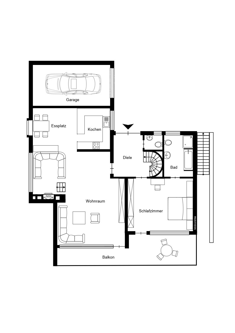 Beim betreten der Wohnung im Gartengeschoss sind alle Räume durch einen Flur miteinander verbunden. Auf der rechten Seite befindet sich die Küche und zur linken Seite befinden sich das Schlafzimmer, sowie das Wohn- bzw. Esszimmer. Am Ende des Flurs findet man das Badezimmer mit Dusche. Durch die Hanglage und die Bodentiefen Fenster profitieren auch die Räume im Untergeschoss von einer angenehmen Helligkeit und einem Blick in den Gartenbereich.